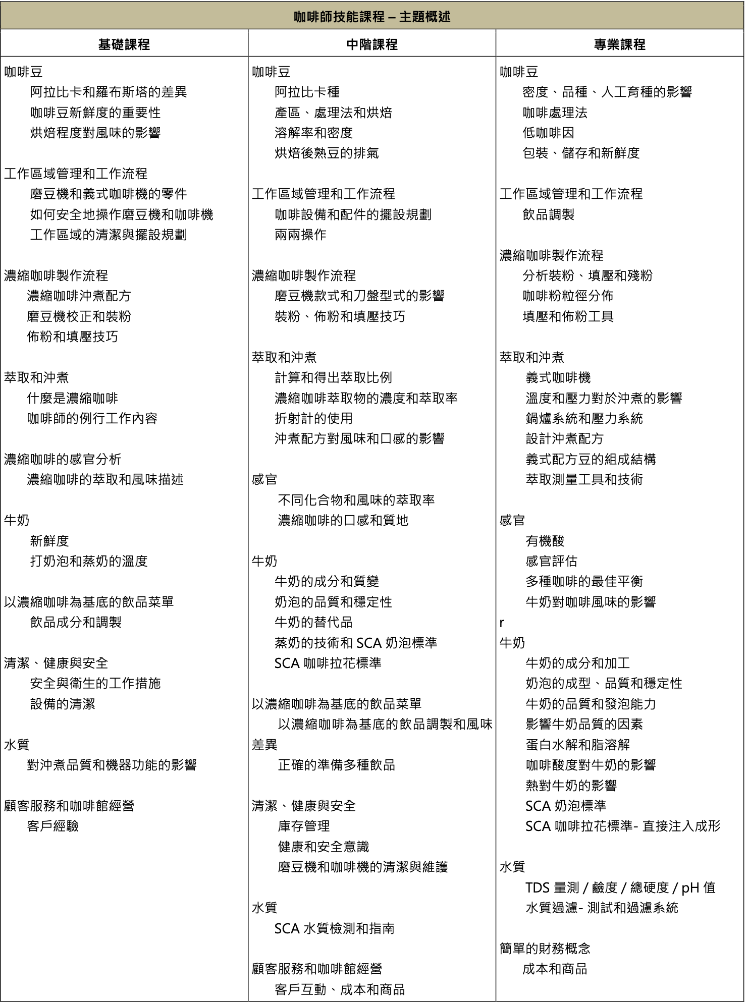 SCA 咖啡技能計畫的咖啡師技能課程分為三個等級: