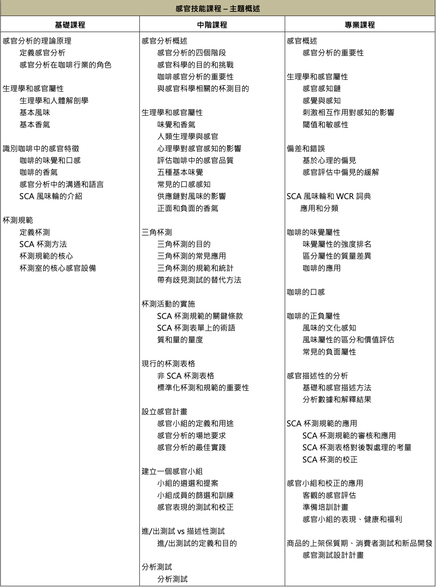 SCA 咖啡技能計畫的感官技能課程分為三個等級: